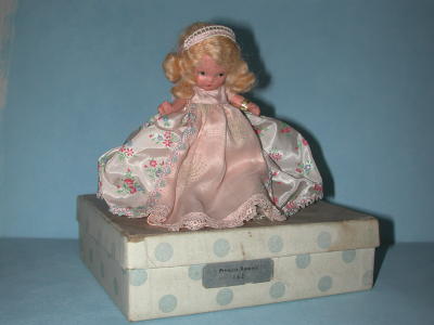 $145 - Bisque, jointed legs, pudgy tummy, wrist tag, labeled box.